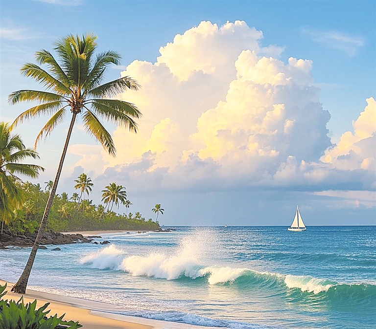 我们9日中午飞抵三亚凤凰机场,入住昌达椰林公寓。这里地处三亚湾中部,椰林环绕,凭窗远眺,距海岸不足百米。临行前京城已是冬装裹身,雾霭频锁,而此时的南海之滨却温暖如春,天蓝海碧,白云清风,令人神清气爽,十分惬意。于是,我们简单吃了点带来的食品,就迫不及待地换上泳装奔向海滨,踏沙海泳,直玩到夕阳西下晚霞映天时分才回到公寓。