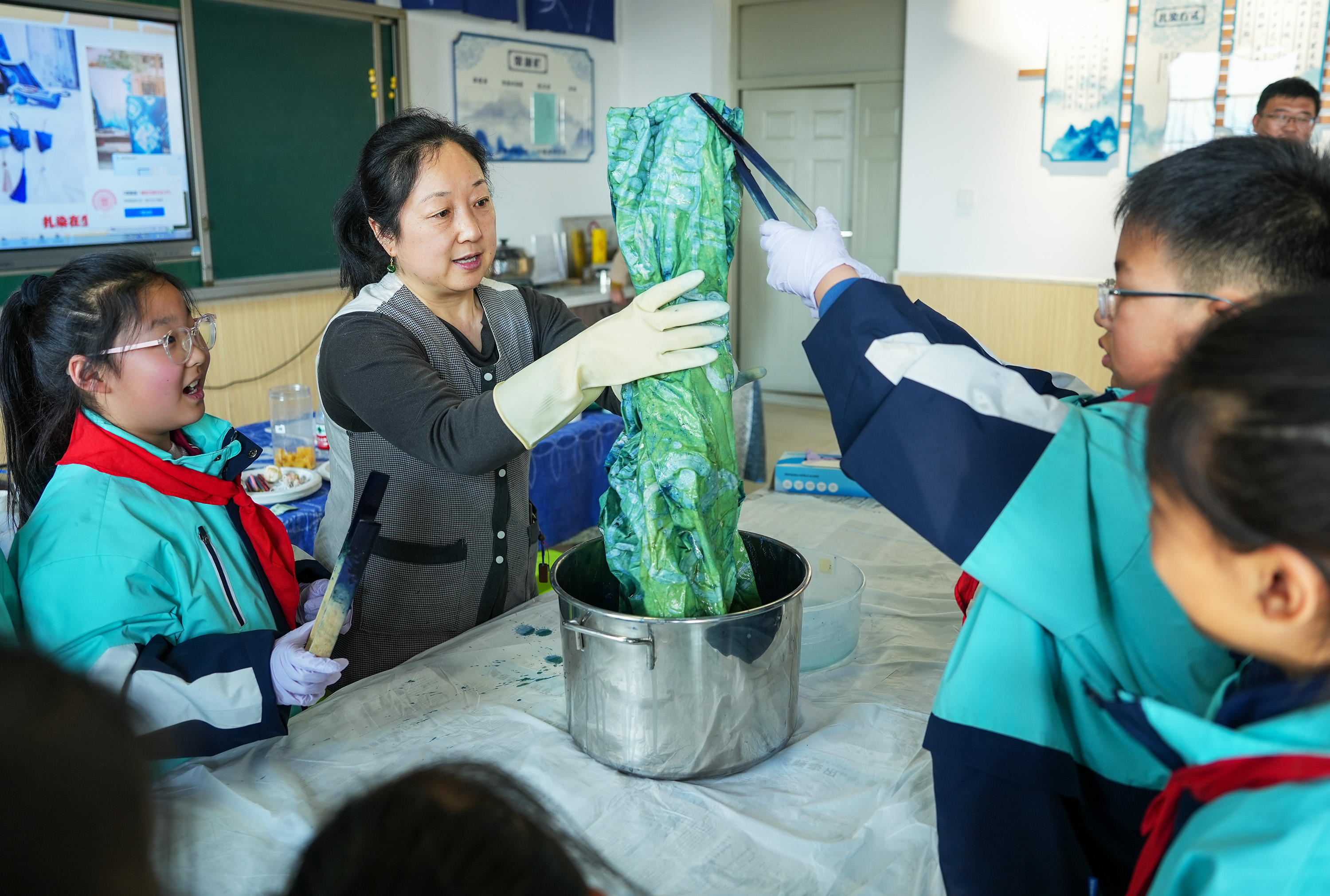 据了解,高阳县创新教育方式方法,推进非遗与思政相融合,着力打造非遗思政教育阵地,坚持以扎染、北方昆曲、高阳短拳等非遗文化为媒,将地方特色资源转化为育人“活教材”,中小幼一体化推进技艺传承、价值引领同频共振。当天的蜡染社团活动现场,宏润幼儿园老师韩倩边向学生示范蜡染技法,边讲述高阳县布里留法工艺学校的故事。孩子们一双双灵巧的小手随着老师的讲解动起来,小心翼翼地用笔沾起蜡液,在白布上认真勾勒图案,20分钟后,图案描摹完成。孩子们将布反复折叠,浸入染料盆中反复浸泡。随着染料发酵,布慢慢变蓝,打开蓝布,布里留法工艺学校建筑图案跃然眼前,孩子们的脸上洋溢着自豪与喜悦的笑容。“今天我们聆听了布里留法工艺学校的故事,把布里留法工艺学校做成漂亮的蜡染作品,很高兴。我的家乡很美、很了不起,我爱我的家乡。”宏润小学二(1)班学生王子牧说。