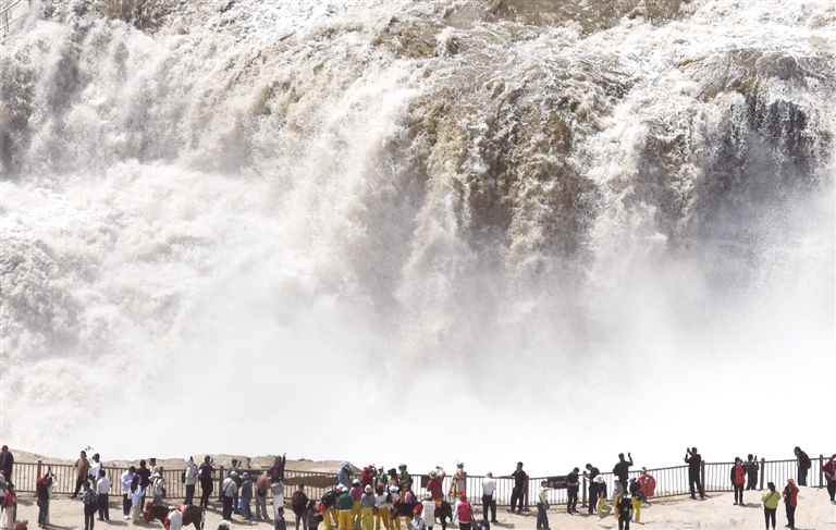 4月9日,游客在山西吉县黄河壶口瀑布景区欣赏壮美“桃花汛”。 近日,受上游冰凌消融和水库调节放水影响,位于山西吉县和陕西宜川县交界的黄河壶口瀑布迎来一年一度的“桃花汛”,吸引了众多游客。 新华社发(吕桂明 摄)