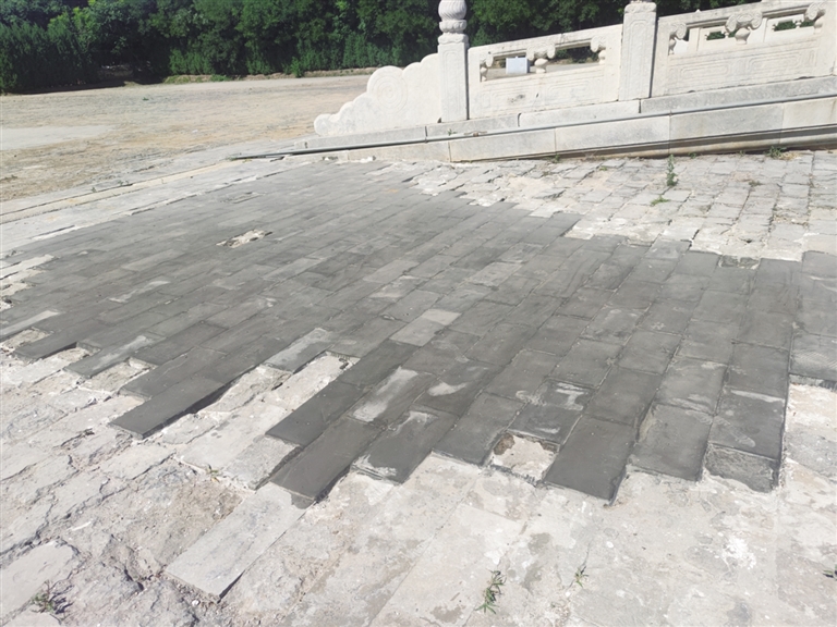保定晚报讯(记者徐月恩 见习记者李俊博)4月9日,易县清西陵泰陵灾后保护修缮工程现场,修旧如旧的地砖静静地躺在见证历史沧桑的五孔桥畔,与周边雍正年间留存下来的旧砖相互映衬,共同构成一幅古朴的画面。