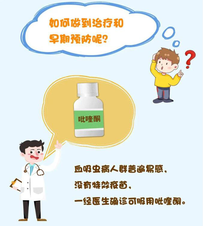 吡喹酮是目前唯一在血吸虫病流行区广泛使用的高效、低毒、使用方便的口服抗血吸虫药物。如果确认感染,应谨遵医嘱服药,加强随访。
