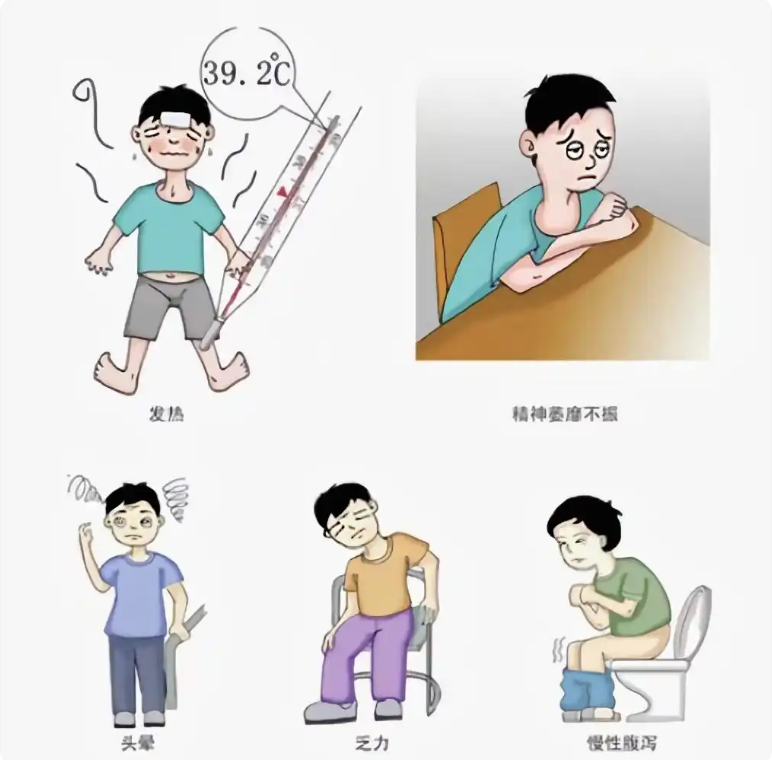 发热、皮疹,腹痛、腹泻、呕吐、肝脾肿大,严重者可出现消瘦、贫血、营养不良、腹水等,甚至死亡。