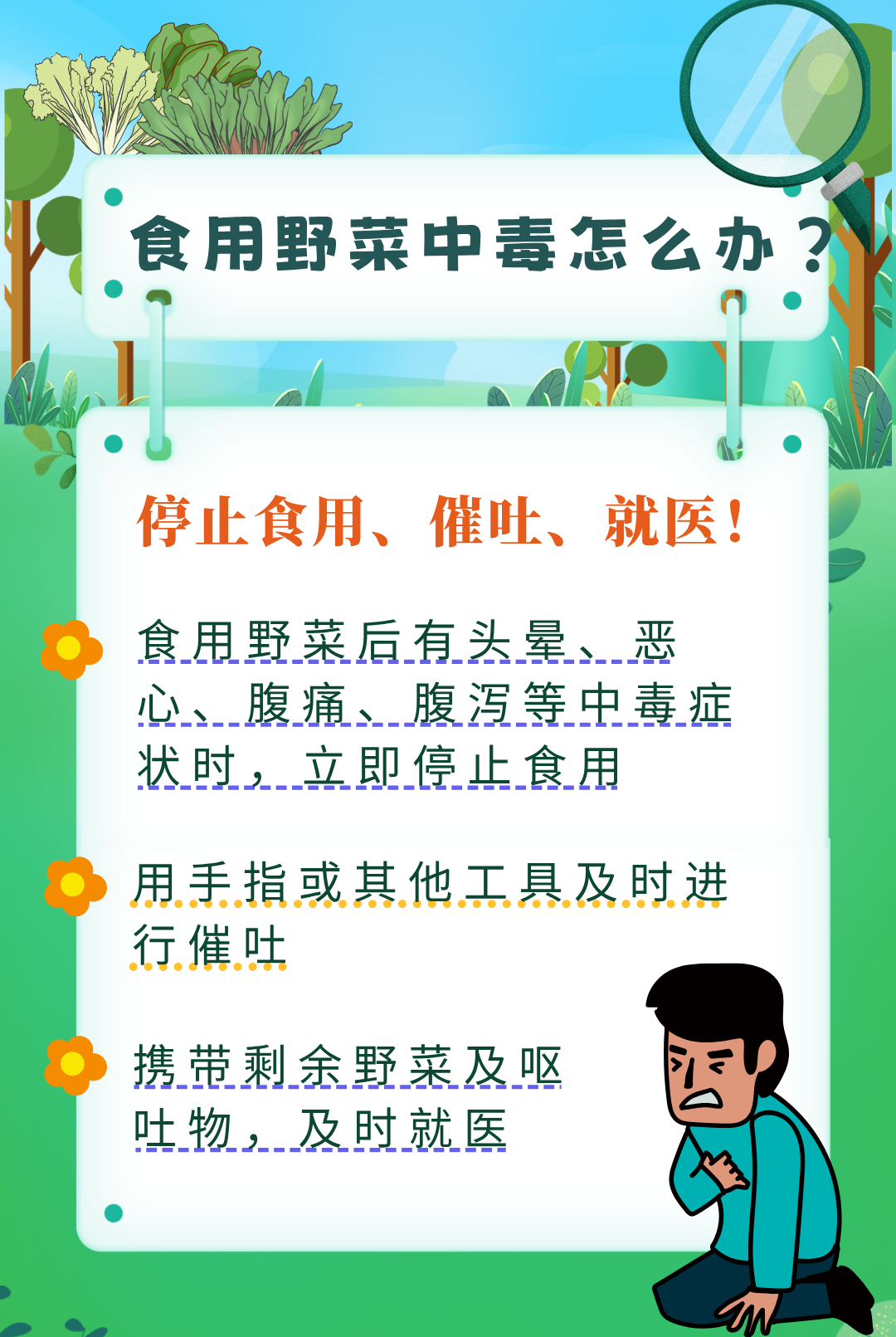 4月是有毒野菜引起食源性疾病暴发事件的高发季节,中毒症状以恶心、呕吐、腹痛、腹泻等胃肠道症状多见,有些可以引起过敏症状,严重的可出现呼吸困难、昏迷,甚至死亡(如:毒芹、狼毒草等)。