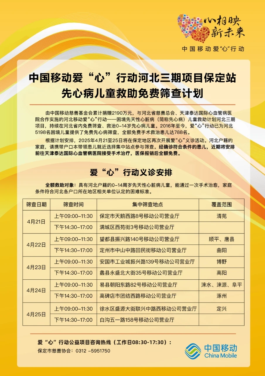 (记者翟青 姚向前 倪策 通讯员多朵)4月21日,中国移动爱“心”行动河北三期项目保定站——先心病儿童救助公益项目免费筛查活动拉开序幕。4月21日至25日,活动将在保定市10个区县设立集中筛查点,实现全市县(市)区全覆盖,为困境儿童提供“筛查-诊断-手术-康复”一站式公益救助服务,助力孩子们重获“心”生。