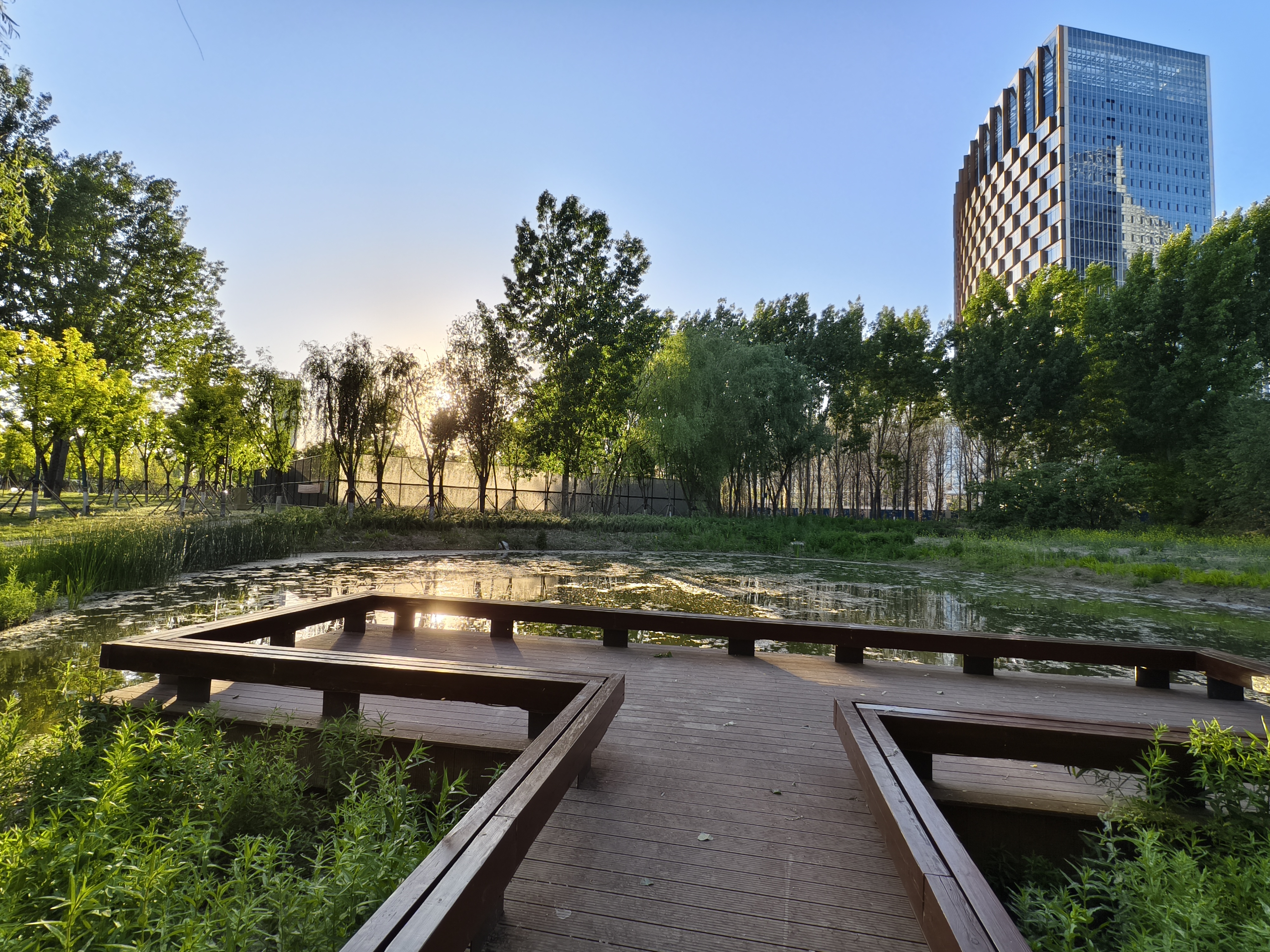坐在水塘边的长凳上,轻轻闭上双眼,鸟叫、蛙鸣和风吹过树叶的沙沙声萦绕耳畔,交织成一段悠扬愉悦的和弦。篮球场上的人正你追我赶,挥汗如雨,小男孩骑着山地车飞快地钻进密林,小狗在宽阔的草坪上撒欢。