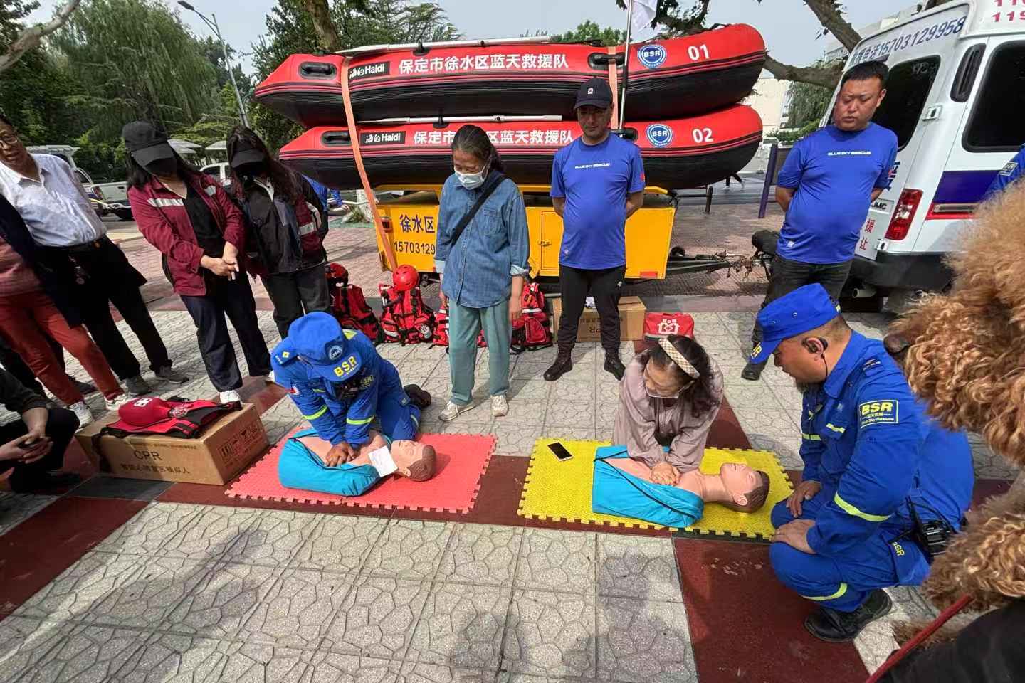 防灾减灾集中宣传活动现场,徐水区蓝天救援队队员开展心肺复苏急救现场教学。 闫森 摄