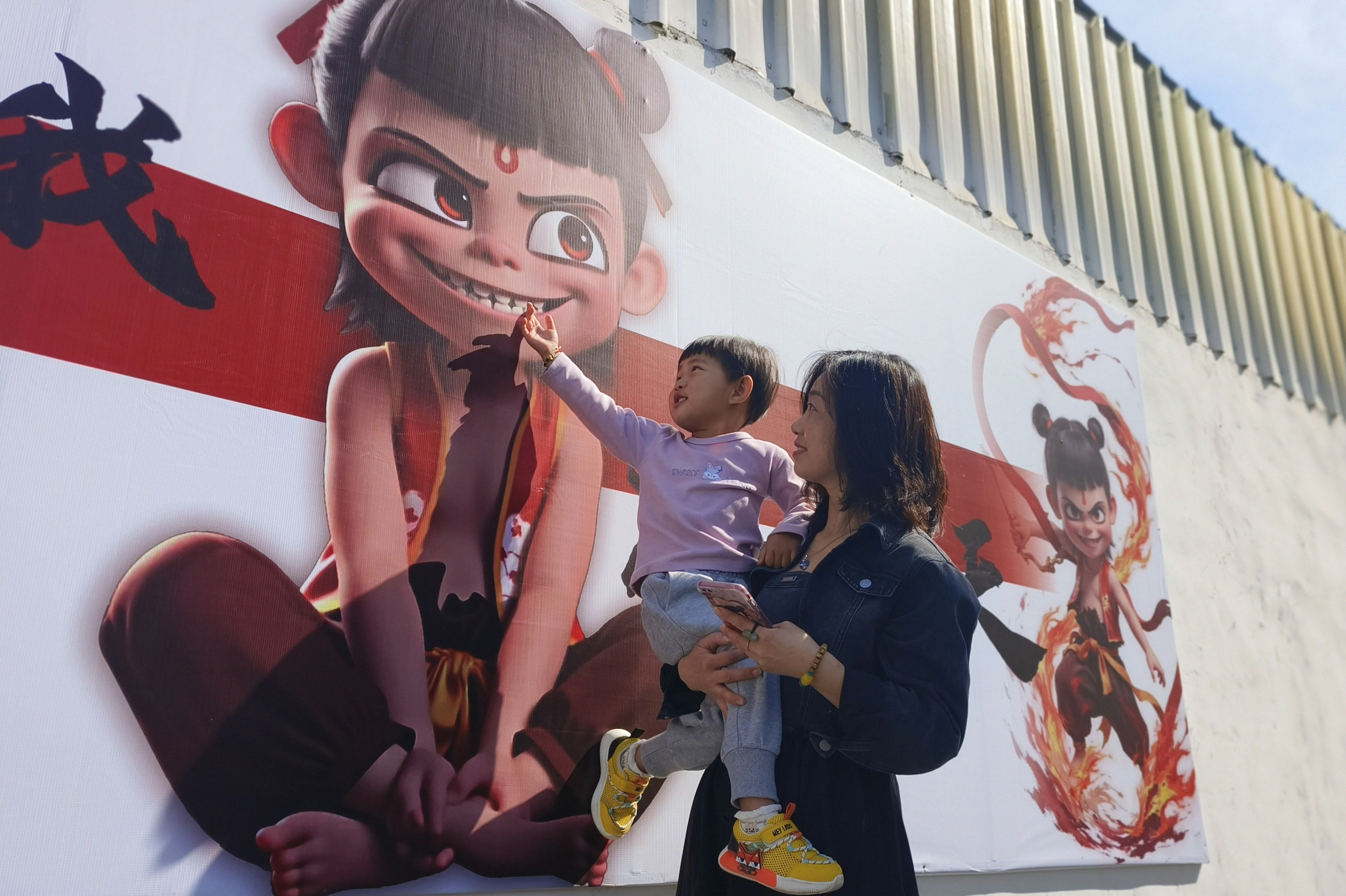 游客打卡“哪吒”主题文化墙。 李月英 摄