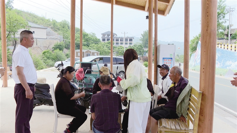5月20日,三尖岭村两委干部向乘凉的村民发放庭院美化绿化倡议书。