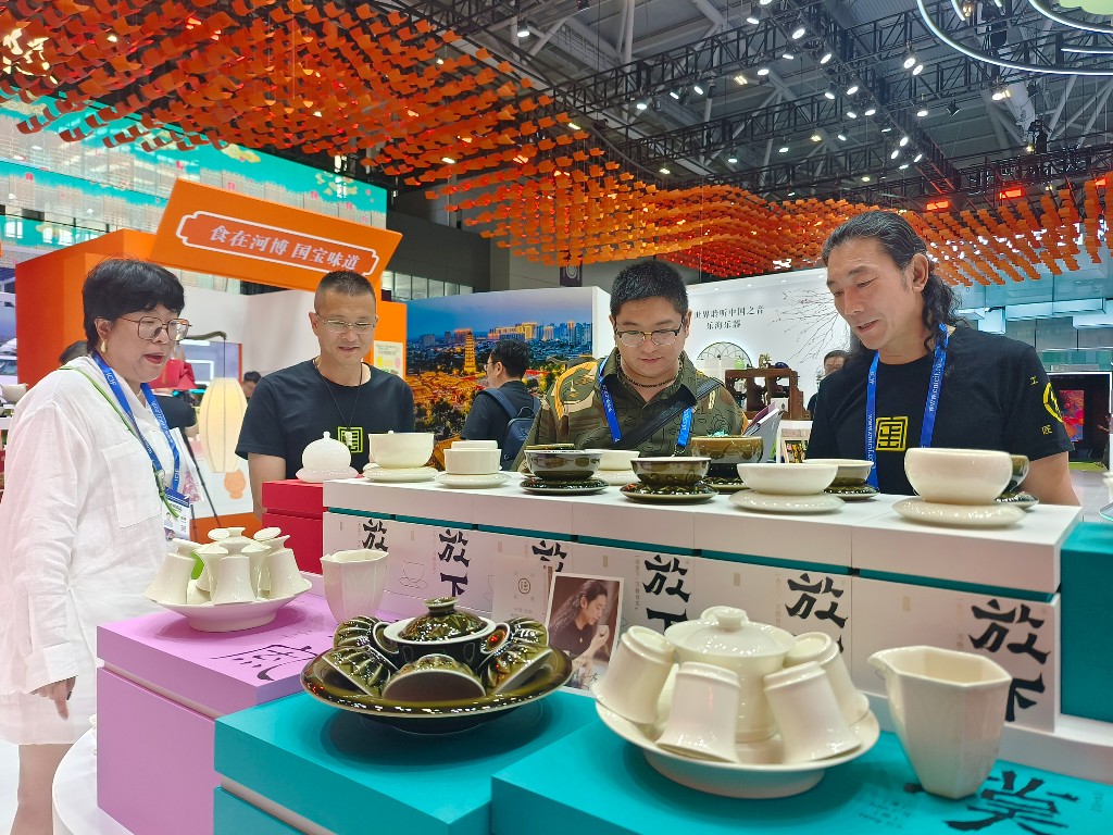 展会上,釉色莹润、质地坚密、造型精准的定瓷产品《孩儿枕》再现了定瓷艺术的独特魅力。来自河北省曲阳陈氏定窑瓷业有限公司的参展产品《定高中状元杯》以及河北弘传定瓷文化创意有限公司的参展产品《转运杯》吸引众多游客欣赏、购买。《定高中状元杯》以状元帽为灵感来源,杯身、杯盖、搅拌棒的不同搭配组合形成了汉字“中”,寓意“高中”。