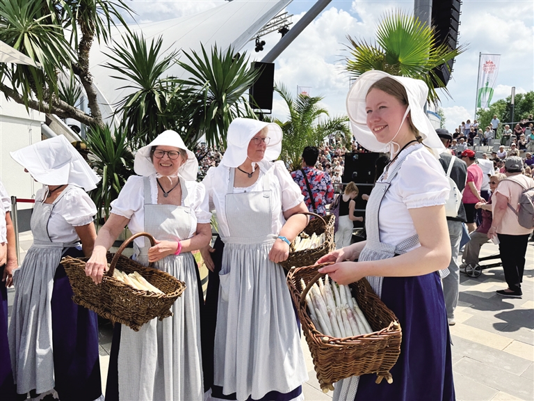 5月31日,在德国贝利茨,人们参加芦笋节。德国贝利茨古城5月30日至6月1日迎来一年一度的芦笋节,其间花车游行、歌舞表演、儿童游艺、“芦笋女王”迎宾、手工艺品展售等活动吸引了约5万名游客。 新华社记者 黄燕 摄