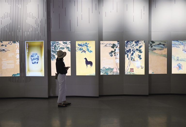6月3日,观众在故宫大高玄殿数字馆参观“腾跃古今——马文化数字艺术展”。当日,故宫博物院大高玄殿数字馆“腾跃古今——马文化数字艺术展”开幕,并面向大中小学生团体预约开放。 大高玄殿数字馆是故宫博物院第二座全数字形态的展厅,是一座集展览、研究、教育等功能于一体的多元化数字空间。此次举办的“腾跃古今——马文化数字艺术展”,聚焦于“马”的精神象征及其与人类社会的紧密联系,重点展示了故宫博物院院藏与马相关500余件超高清文物影像数据,借助沉浸式投影、三维互动、知识图谱等前沿技术手段,让这些难得一见的珍贵文化遗产“活起来”。 新华社记者 金良快 摄