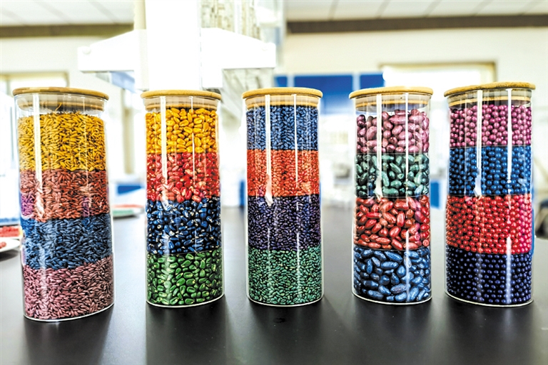 穿“铠甲”的种子什么样?带着好奇心,记者来到北农(海利)种子处理剂研发中心实验室。操作台上五颜六色的颗粒格外醒目——金黄、碧绿、绛红、靛蓝、亮紫,仔细一看,原来是小麦、玉米、花生、大豆、小米等作物种子,玛瑙般泛着光泽,煞是好看。