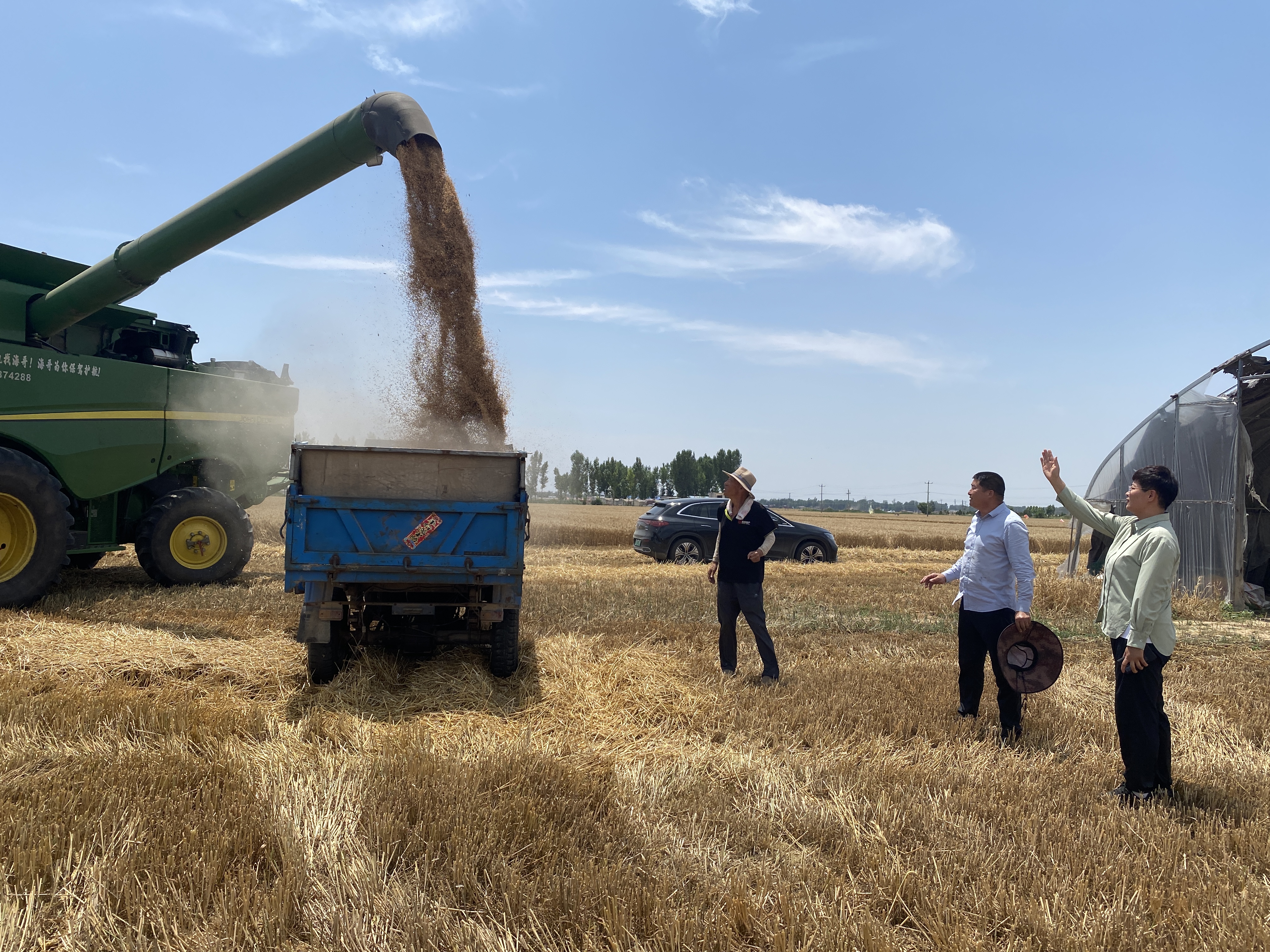 11时许,随着3台大型联合收割机的轰鸣声响起,在穗行圃、原种区、新品种选育区等外围,几台大型收割机开始穿梭于千亩农场,麦粒从收割机仓门倾泻而下,装入运粮车,一派繁忙丰收景象。