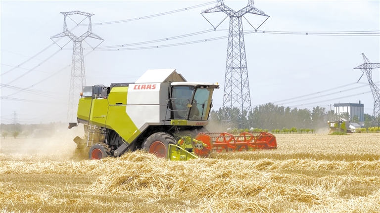 20日上午,定兴县姚村镇辛木村的麦田里,隆隆轰鸣的收割机欢快地行走在滚滚麦浪间,一排排金黄小麦被整齐地切割、脱粒、装车,一气呵成。
