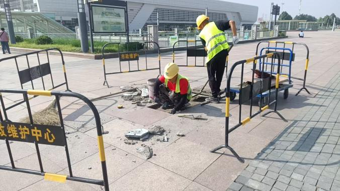 市政维护中心响应民生需求,组织专业技术人员对东站广场便道砖进行全面排查维修。在维修现场,施工人员对破损便道砖进行拆除,清理基层杂物,铺设高强度、耐磨的优质石砖。为最大限度减少施工对市民出行的影响,施工现场还安排专人维护秩序,设置明显的警示标志,引导行人安全通行。