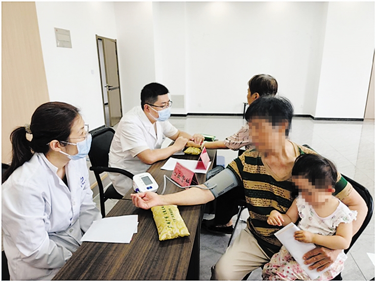 活动现场,医务人员为居民测量血压,仔细询问身体情况,针对常见老年健康问题,提供个性化调理建议。医务人员还为居民提供了丰富的中医体验项目,包括免费贴三伏贴、耳穴埋豆、测量血压和把脉问诊等,针对患者体质与症状进行中医理疗。