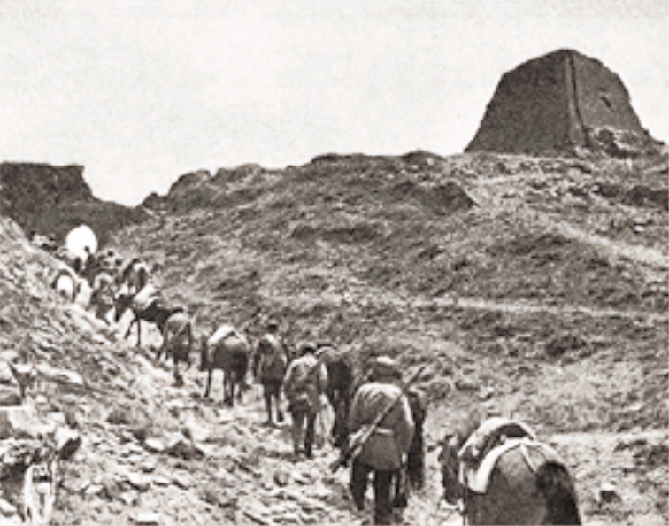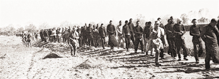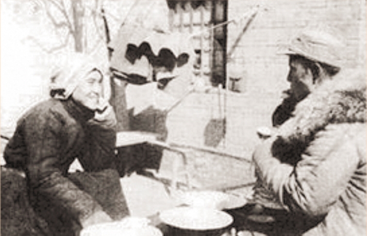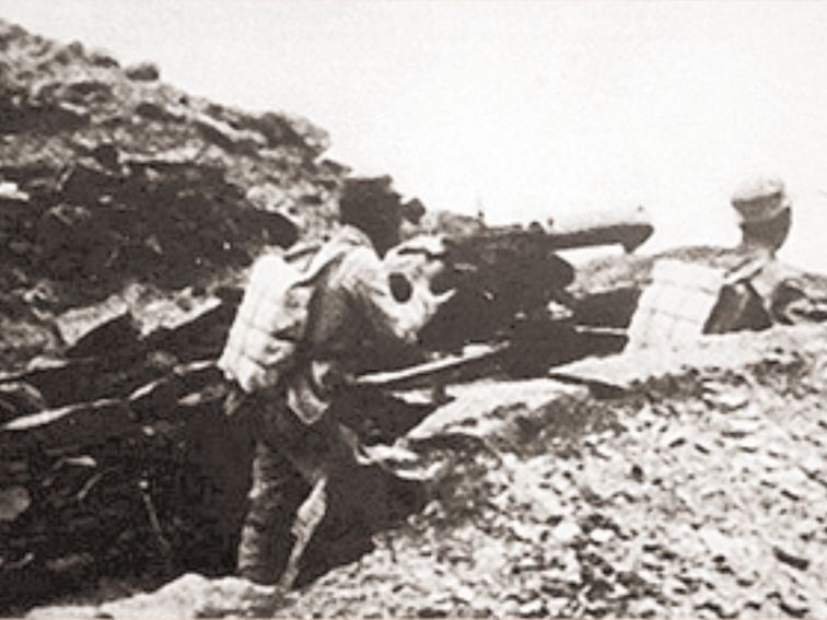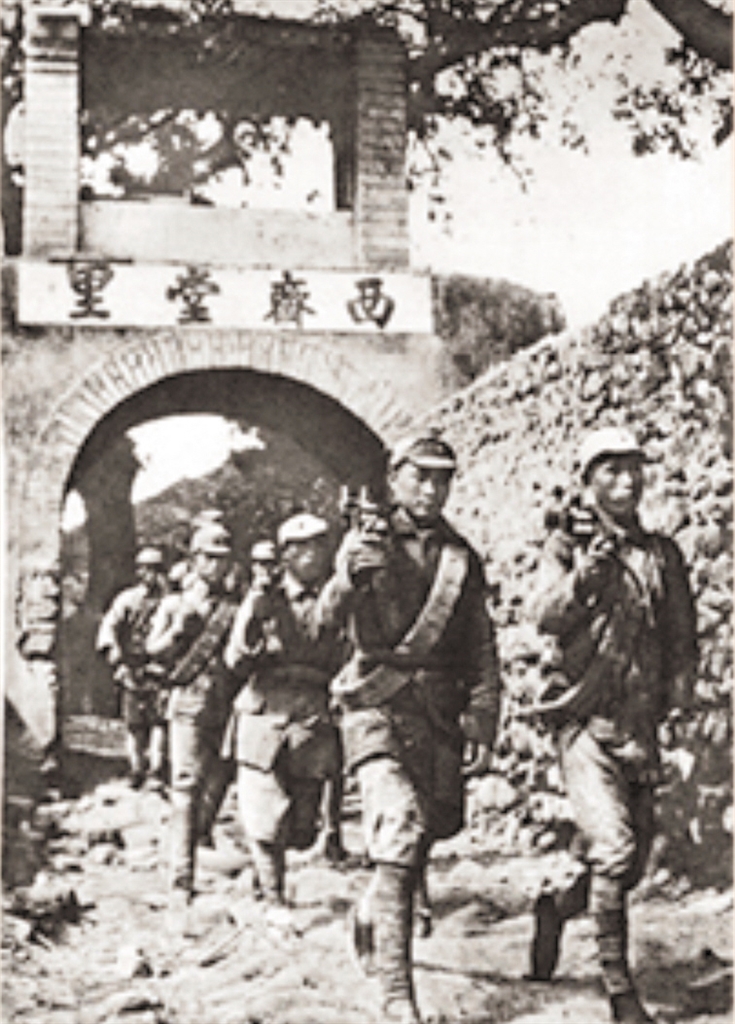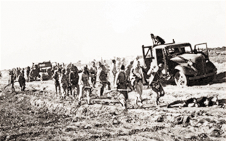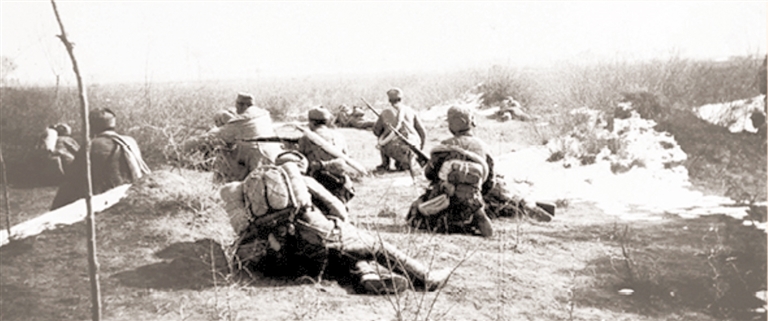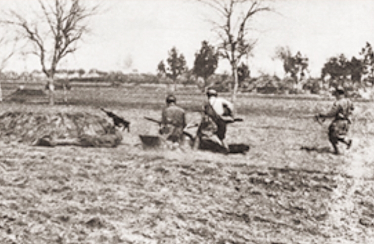 1939年2月,冀中漕河战斗中,八路军战士和日军展开肉搏战。图为八路军三勇士当场刺死日军两名,缴获重机枪一挺。