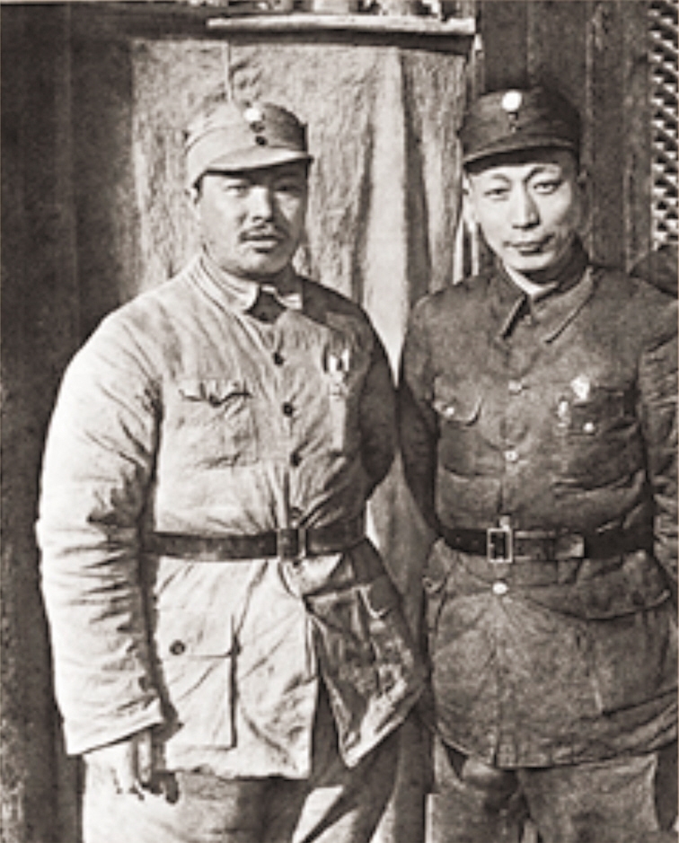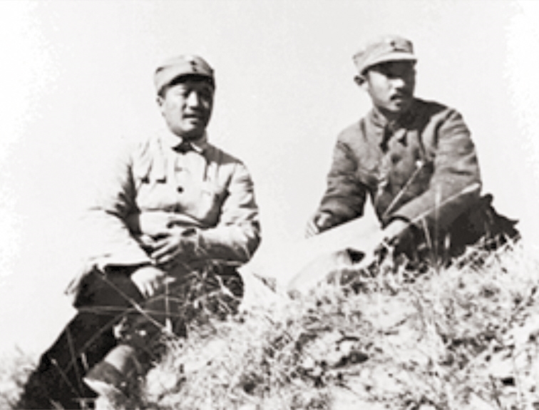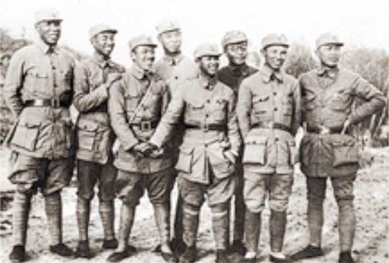 1940年,中共冀中区委书记黄敬与战友们在晋察冀抗日根据地合影,左起:聂鹤亭、萧克、陈伯钧、彭真、舒同、黄敬、朱良才、陈漫远。