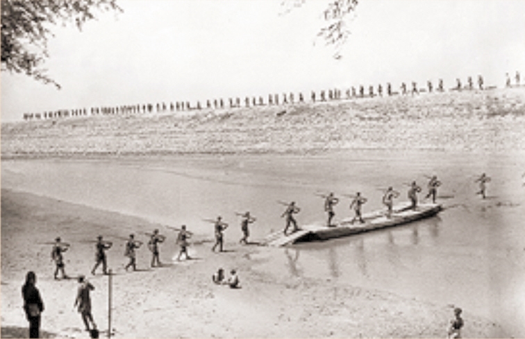 1938年5月4日,根据中共中央指示,晋察冀军区将人民自卫军与河北游击军合编为八路军第三纵队,同时成立冀中军区。冀中军区成立后,司令员吕正操(船中间站立者)率部开赴大清河沿岸地区。