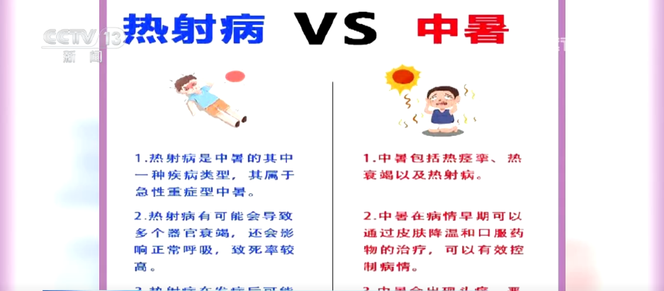 第四,热射病,也是最严重的一种致命性的疾病,因为高温导致的体温调节中枢系统功能衰竭,身体无法散热,核心体温骤升,危及多器官功能,识别的症状是核心体温超过40℃,这是一个很关键的指标。若不及时就医就会发生非常严重的事件。