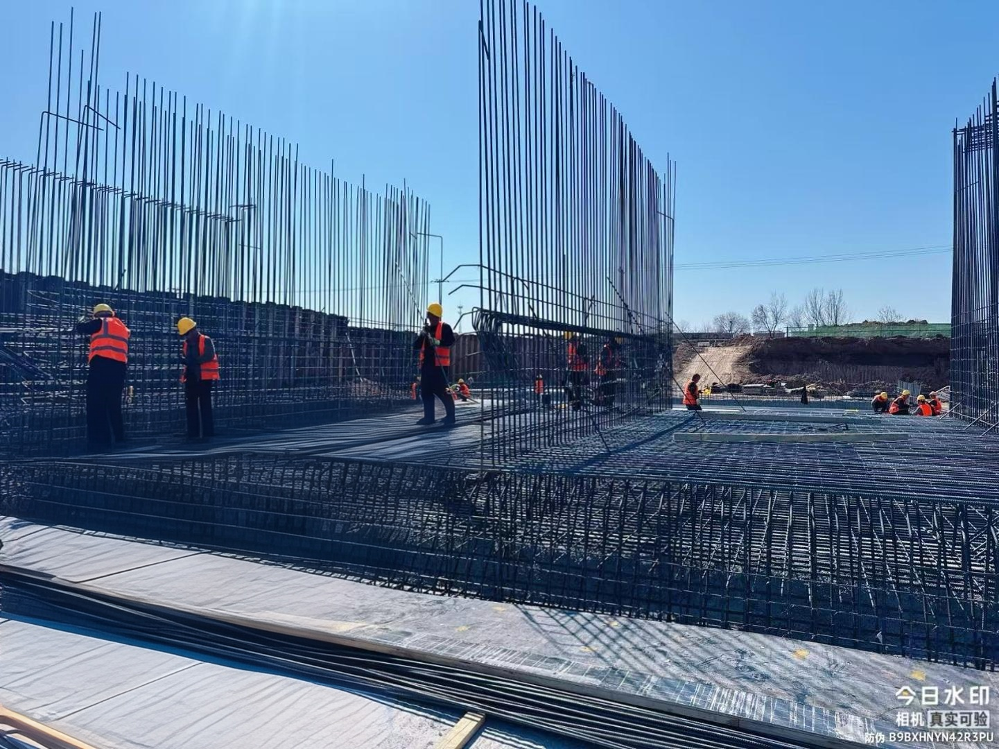 工人们正在进行六各庄排水闸涵洞及闸室段基础钢筋绑扎作业。受访单位供图