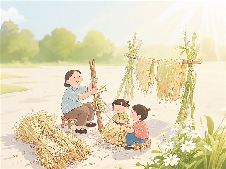 我家的自留地边有一道小沟,父亲把它推土填平后,每年都种上好麻。等收获后,母亲把枝杈和叶子剡光,我和父亲便把麻捆扛来沤麻,沤好后弄回家中,父亲让我随他一劈一套一拽地剥麻。等麻皮晾干了,母亲乐呵呵地说,这些麻就够咱一家7口人用了。