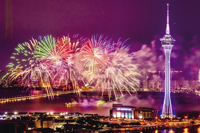 这是9月6日晚拍摄的烟花汇演。由澳门特区政府旅游局主办的第33届澳门国际烟花比赛汇演6日晚拉开序幕,吸引众多市民和游客观看。共有10个国家的烟花公司参加本届赛事,分别在9月6日、13日、20日以及10月1日和6日呈献绚丽烟花表演。 新华社发