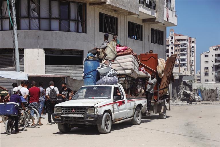 9月6日,巴勒斯坦人携带家当逃离加沙城。以色列国防军6日发表声明说,鉴于加沙城地面行动的扩大及在“基甸战车2”行动中对巴勒斯坦伊斯兰抵抗运动(哈马斯)据点的占领,以军当日在加沙南部汗尤尼斯地区设立人道主义援助区。 新华社发(里泽克·阿卜杜勒贾瓦德 摄)