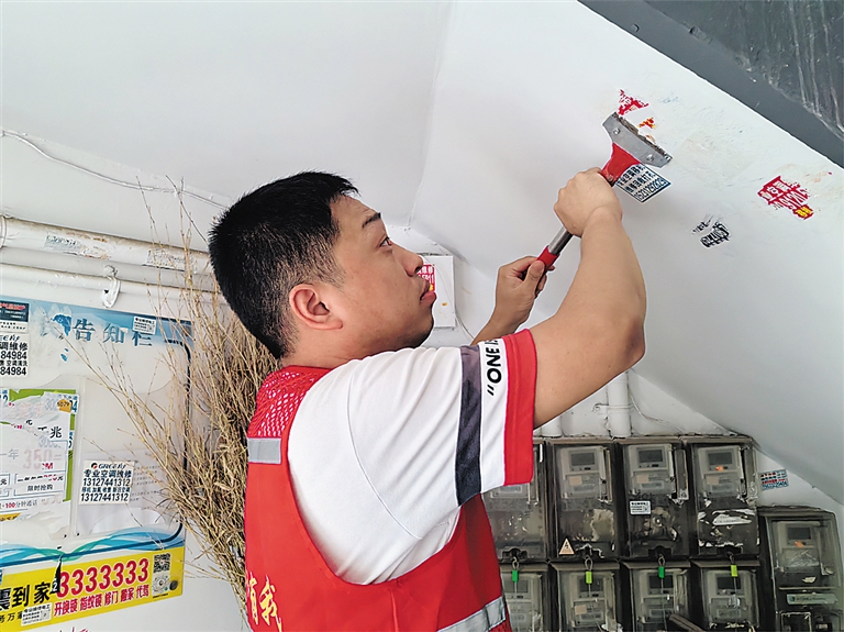 9月4日,竞秀区铁西社区组织工作人员与志愿者,对辖区老旧小区楼道内的小广告及卫生死角展开集中清理行动。志愿者们仔细铲除楼道墙壁上各类杂乱小广告,并对楼道内掉落的小广告残片、碎纸屑等垃圾全面清扫。经过大家的共同努力,原本一条条布满“城市牛皮癣”和垃圾的楼道变得焕然一新,恢复了干净整洁的面貌。 于玥 摄