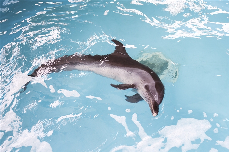 9月8日,海豚“万万”在海南陵水的救助池中游动。今年6月在海南万宁获救的搁浅海豚“万万”,经过专业救护团队近三个月的精心照护,目前体征平稳、状态良好。专家组综合评估后认为其已具备野外放归条件,计划择日将其送回大海。