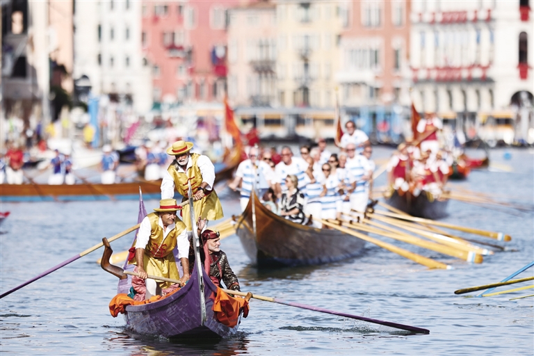 9月7日,在意大利威尼斯,人们参加赛船节的船队游行。威尼斯赛船节于每年九月第一个周日举行。 新华社记者 李京 摄