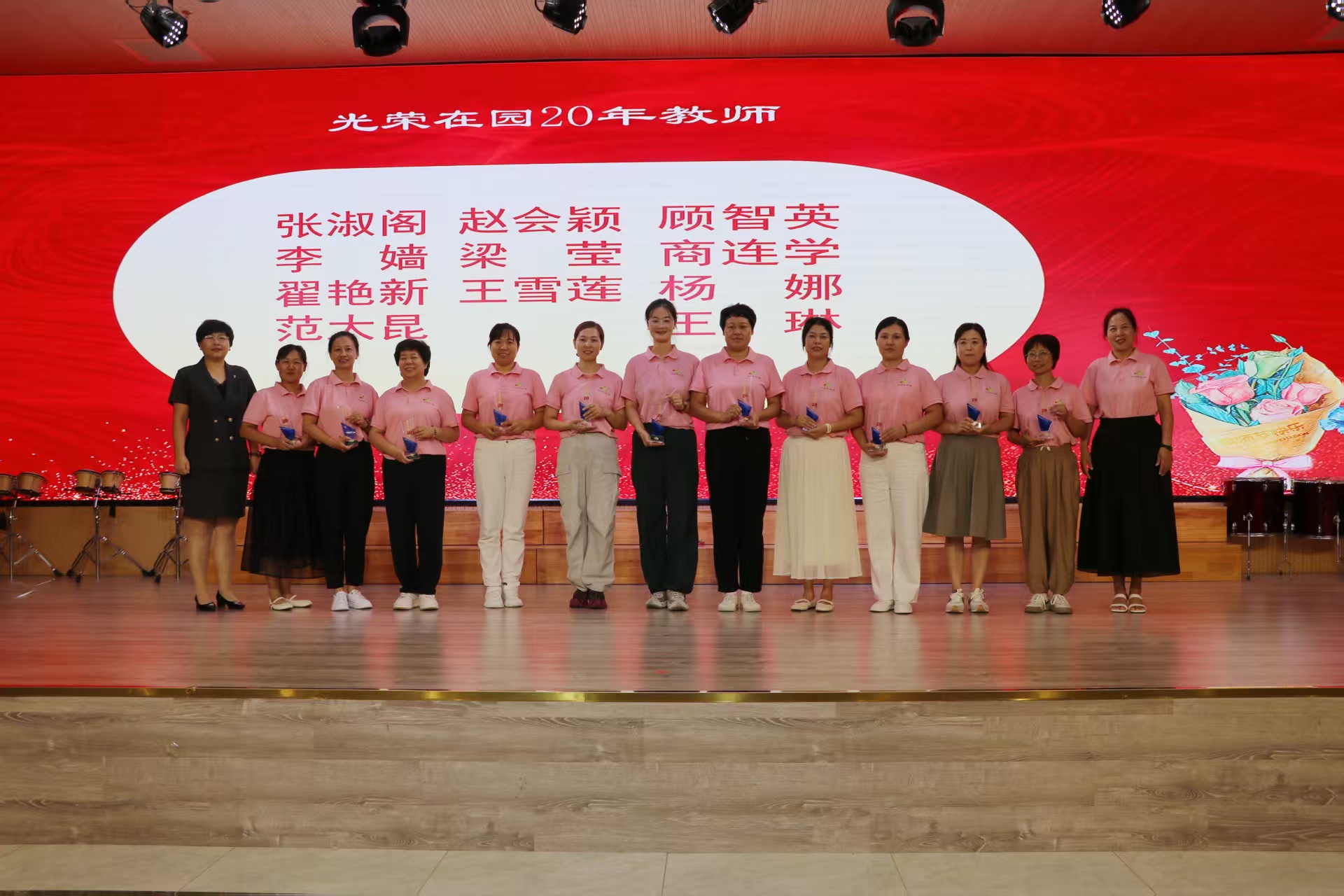 该园特别设立“光荣在园20年”奖项,11位资深教师获颁纪念奖杯。她们数十年如一日的坚守与奉献,成为市二幼教育事业的坚实基石。同时,2025年上半年优秀班主任、优秀教师、优秀后勤员工等18位先进个人,14位“学习之星”“全勤班级之星”“宣传之星”和4个优秀班集体依次登台领奖,现场掌声此起彼伏。在幼儿园负责人带领下,全体教职工高举右拳,庄严宣读“大力弘扬教育家精神”誓词。