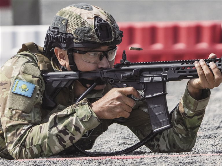 9月8日,哈萨克斯坦参赛队员在比赛中。当日上午,首届中国—中亚公安内务部门特种警察技能挑战赛在新疆乌鲁木齐开幕。本次挑战赛为期3天,来自中国、哈萨克斯坦、吉尔吉斯斯坦、塔吉克斯坦、乌兹别克斯坦5个国家的80名特警队员参赛。 新华社记者 殷刚 摄