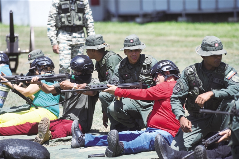 9月13日,委内瑞拉民兵在位于首都加拉加斯的蒂乌纳堡陆军基地进行射击训练。近期,美国和委内瑞拉关系持续紧张。美国以“打击拉美贩毒集团”为由在委内瑞拉附近加勒比海域部署多艘军舰。委内瑞拉总统马杜罗驳斥美方谎言叙事,宣布将在全国284个“前线”地点部署防御力量,以应对可能的军事入侵。