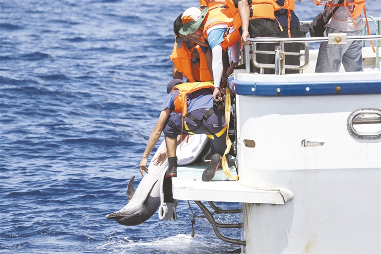 9月14日,在海南万宁一处海域,救助人员将海豚“万万”放归大海。