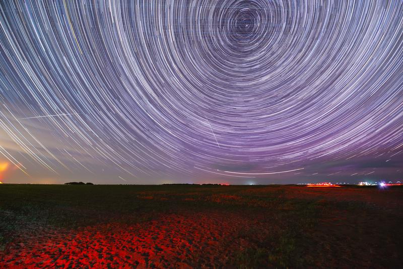 2025年6月2日在佳木斯市桦川县车轱辘泡湿地拍摄的极光与星空(堆栈合成照片)。新华社发(陈志国 摄)