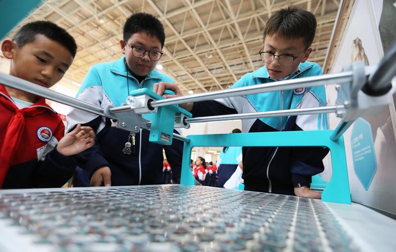 2025年9月8日,甘肃省定西市安定区关川实验学校的学生在流动科技馆内体验科普装置。新华社发(王克贤 摄)