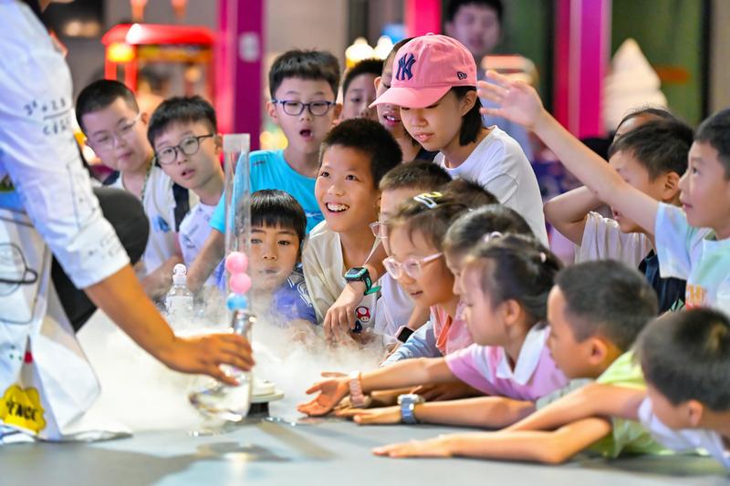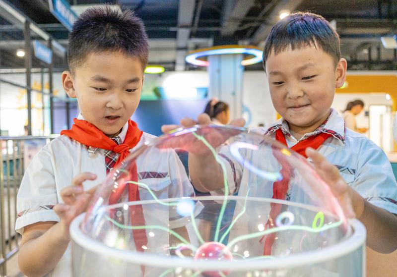 2025年8月9日,孩子们在位于天津的滨海科技馆内体验科普实验。新华社发(杜鹏辉 摄)