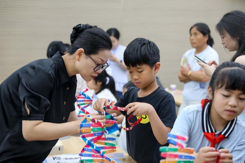2025年7月25日,合肥综合性国家科学中心大健康研究院工作人员辅导孩子们组装DNA双螺旋结构模型。新华社记者 曹力 摄