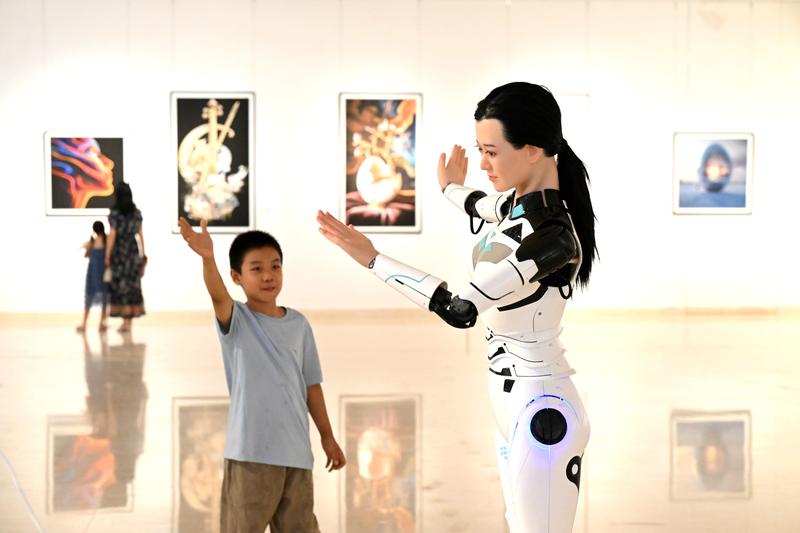 2025年7月14日,小朋友在河北省石家庄市美术馆AI艺术画展体验区与机器人互动。新华社发(陈其保 摄)