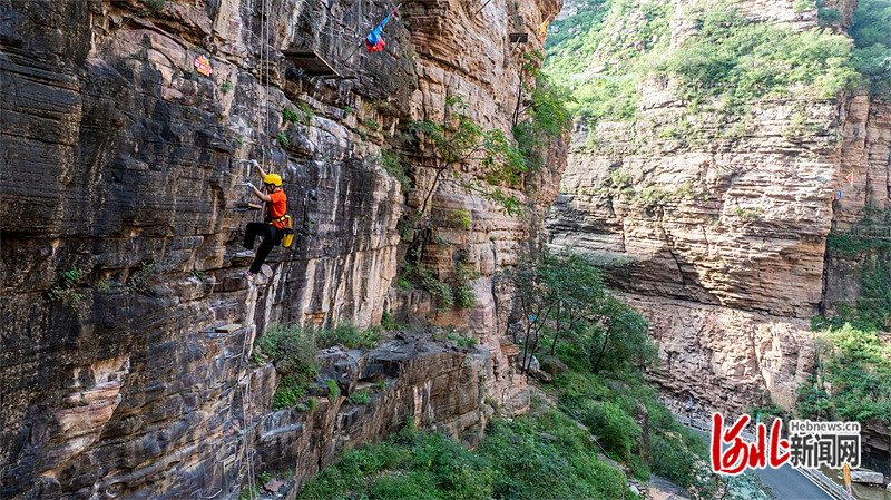 在邢台大峡谷景区,游客穿戴专业攀岩装备在体验飞拉达项目。图片来源:河北新闻网