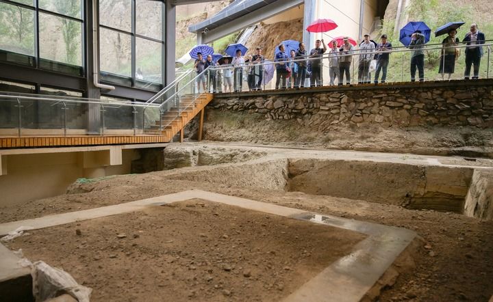 登临1号积石冢所在高地,可见考古工作者已清理出约1500平方米的平面区域,冢上积石被有序堆放在一旁。地面分布着以石块堆围而成的圆、方形坑穴,部分被标注为祭祀坑,另一些则为石墓。