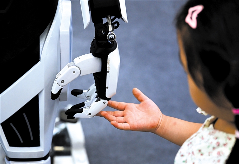 9月21日,小朋友在2025世界制造业大会智能机器人展区和一款人形机器人互动。 9月20日至23日,2025世界制造业大会在安徽省合肥市举行。在大会上,“智能机器人展区”成为最热门的打卡地,吸引了大批观众前来参观。机器人乐队、机器人搬运工、机器人服务员……各种类型的机器人大显身手,为人们展示未来生活的无限可能。 新华社记者 周牧 摄