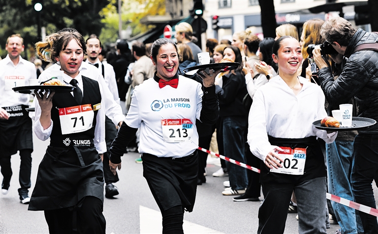 9月21日,参赛者在法国巴黎参加服务员赛跑。当日,法国首都巴黎举行具有百年历史的服务员赛跑活动。数百名穿着制服的男女服务员手托餐盘,餐盘内放着羊角面包、一个空咖啡杯和一杯水,从巴黎市政厅出发,沿环线跑完4公里的赛程。巴黎服务员赛跑最早始于1914年。今年还增加了普通民众赛跑环节。 新华社记者 高静 摄