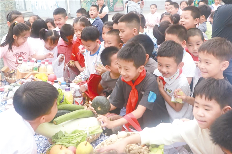 学校升旗广场上热闹非凡。每个班级的摊位前都摆满了孩子们收集来的五谷杂粮、瓜果蔬菜,有的孩子们化身为小小销售员,或大声吆喝,或热情介绍,卖力地推销着自己班级摊位上的物品,吸引同学们前来“购买”。没有承担“销售”任务的孩子们则在校园里走走逛逛,用校园币购买心仪的物品,在活动中感受劳动成果的美好。
