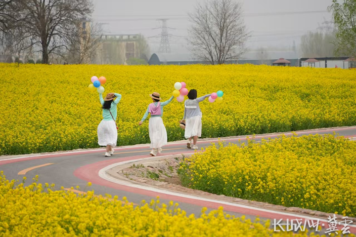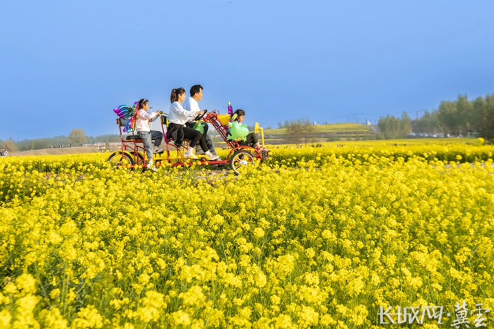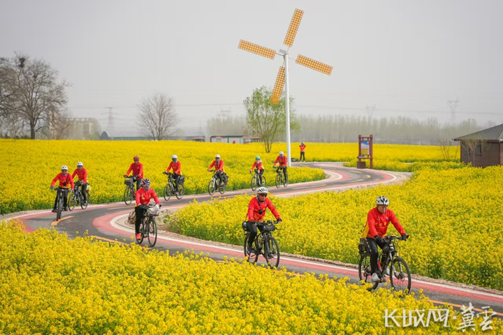游客在金沙河红薯岭的油菜花海骑行游玩。通讯员高儒森 供图