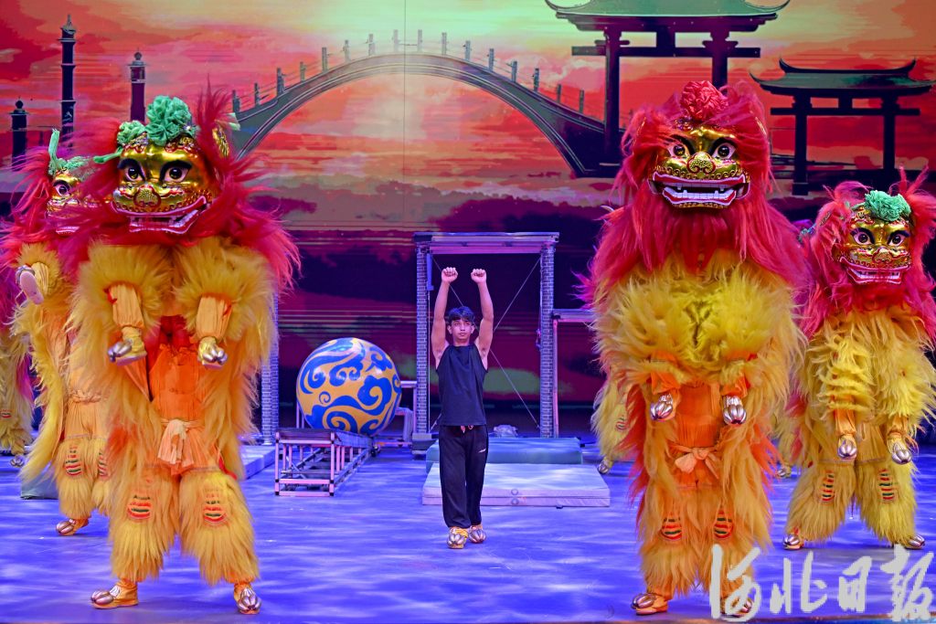 9月21日,由河北省杂技团和沧州杂技团联手创排的《祥狮跃九州》在吴桥东方杂技城进行排练。河北日报记者 张 昊摄