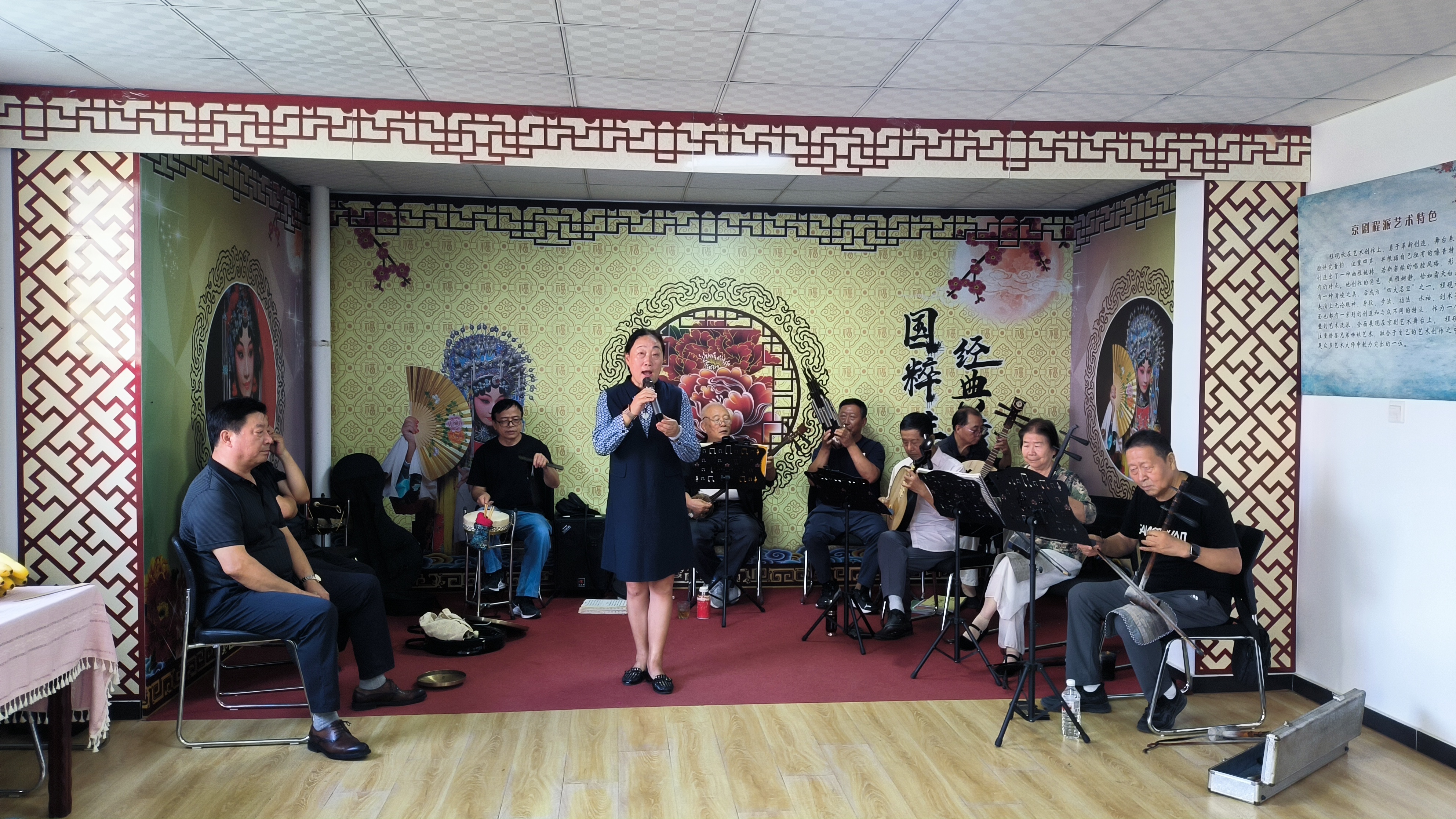 活动现场,来自白沟新城、雄安新区的戏曲爱好者与本地名家和社区票友齐聚一堂切磋技艺,文场与武场的珠联璧合成为最大亮点。文化名家工作室声乐老师代表文场,白沟新城、雄安新区声乐老师则代表武场,双方配合默契、相得益彰。京胡悠扬婉转,三弦清亮悦耳,大锣小锣节奏分明,传统乐器的交织共鸣令现场观众如痴如醉。