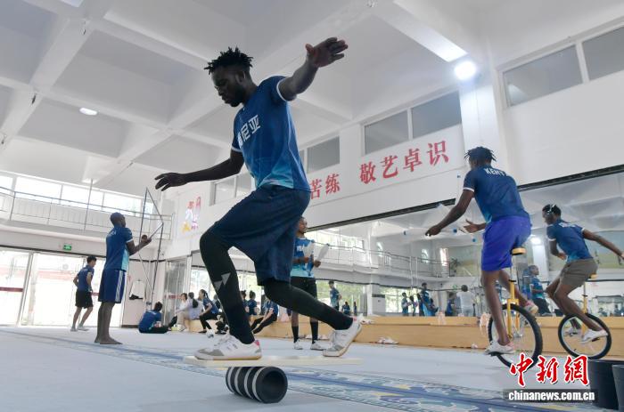 9月25日,来自肯尼亚等国家的杂技学员在河北吴桥杂技艺术学校练习杂技。 中新网记者 翟羽佳 摄