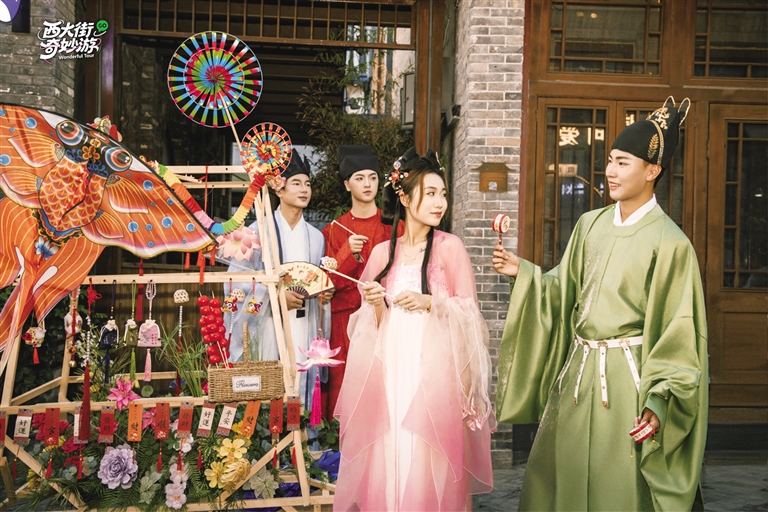 作为古城文化地标,西大街此次以“沉浸互动”为核心,推出多元体验。10月1日至8日17:00-22:00,“双节奇妙游”活动持续上演。6大故事主演NPC身着宋代服饰穿梭街区,与游客开展猜灯谜、学古礼等线下挑战,参与者可赢取可抵扣街区消费的“银票”。活动同步开启线上直播,让未到场市民也能“云游”古街。